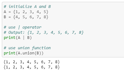 - Union is performed using | operator. Same can be accomplished using the method union().