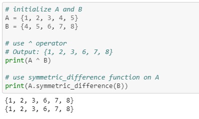 - Symmetric difference is performed using ^ operator. Same can be accomplished using the method symmetric_difference().