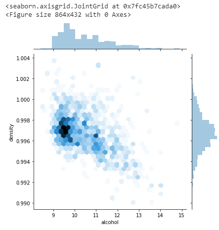 sns.jointplot(y=data["density"],x=data["alcohol"],kind="hex")