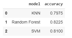 report = pd.DataFrame({'model': models, 'accuracy': accuracies})